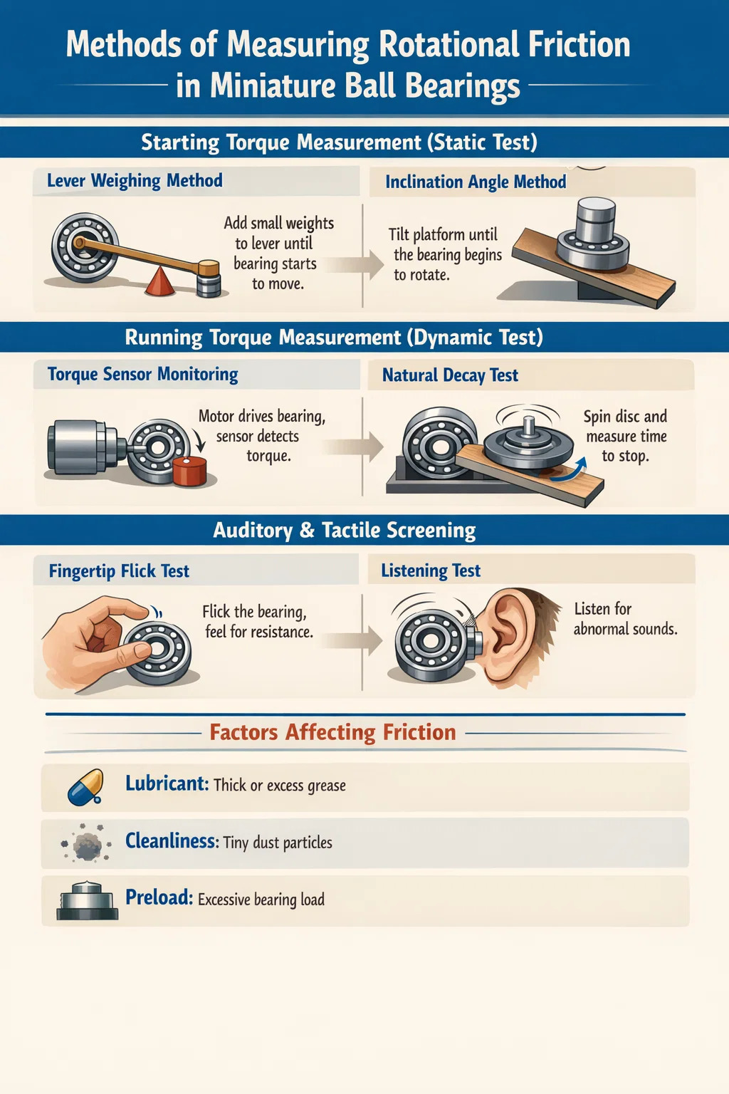 Método del ángulo de inclinación: el rodamiento se monta en una plataforma con un ángulo ajustable y se coloca un objeto de peso fijo sobre el rodamiento. Un extremo de la plataforma se eleva lentamente hasta que el cojinete comienza a deslizarse o girar. Cuanto mayor sea el ángulo de inclinación de la plataforma, mayor será la resistencia a la fricción de los rodamientos de bolas en miniatura.